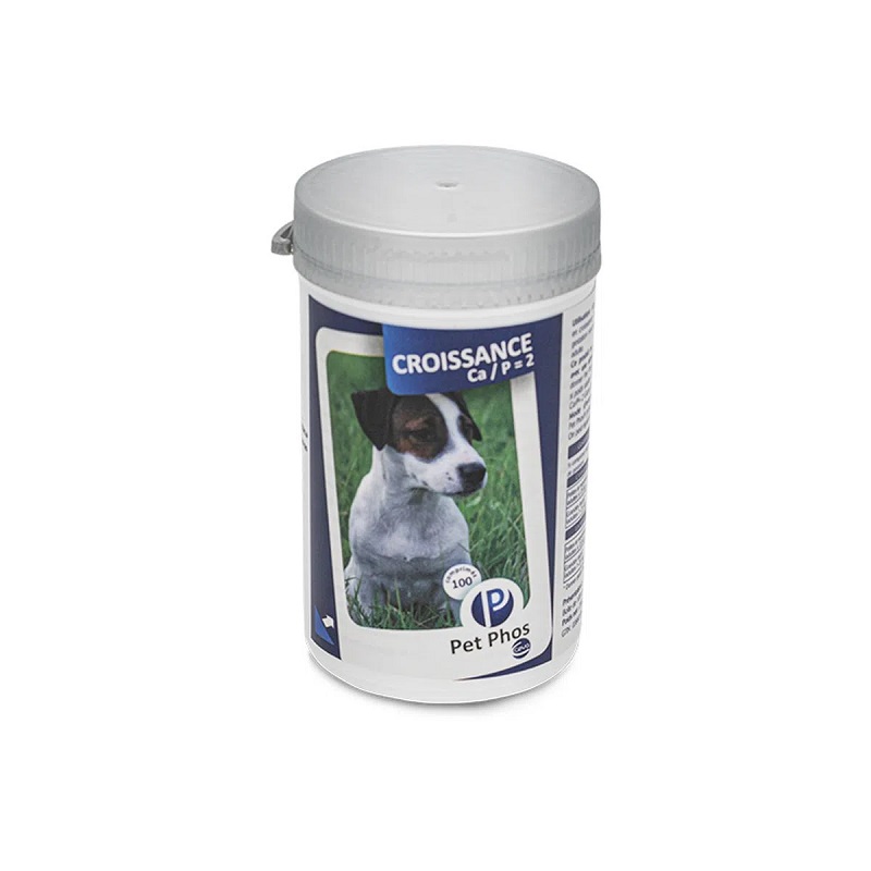 Supliment vitamino-mineral recomandat cainilor juniori de talie mica si medie Pet Phos Croissance Ca/P=2, 100 comprimate divizabile, Ceva Sante